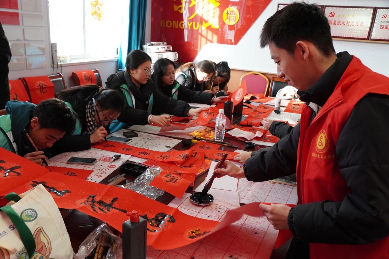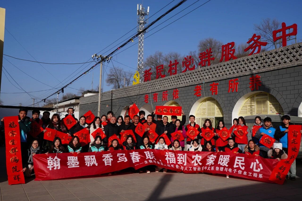 2025年12月7日,吕梁学院组织生物与食品工程系、数学与人工智能系、中文系、物理系多院系师生代表,携手书法社成员,赴方山县新民村、庙底村开展“春联下乡,剪纸寄情”主题文化惠民活动。近百幅手写春联、百余件精美剪纸作品送到村民手中,以传统文化为纽带,为乡村振兴注入暖心文化力量,让冬日山乡洋溢着浓浓的年味与暖意。
