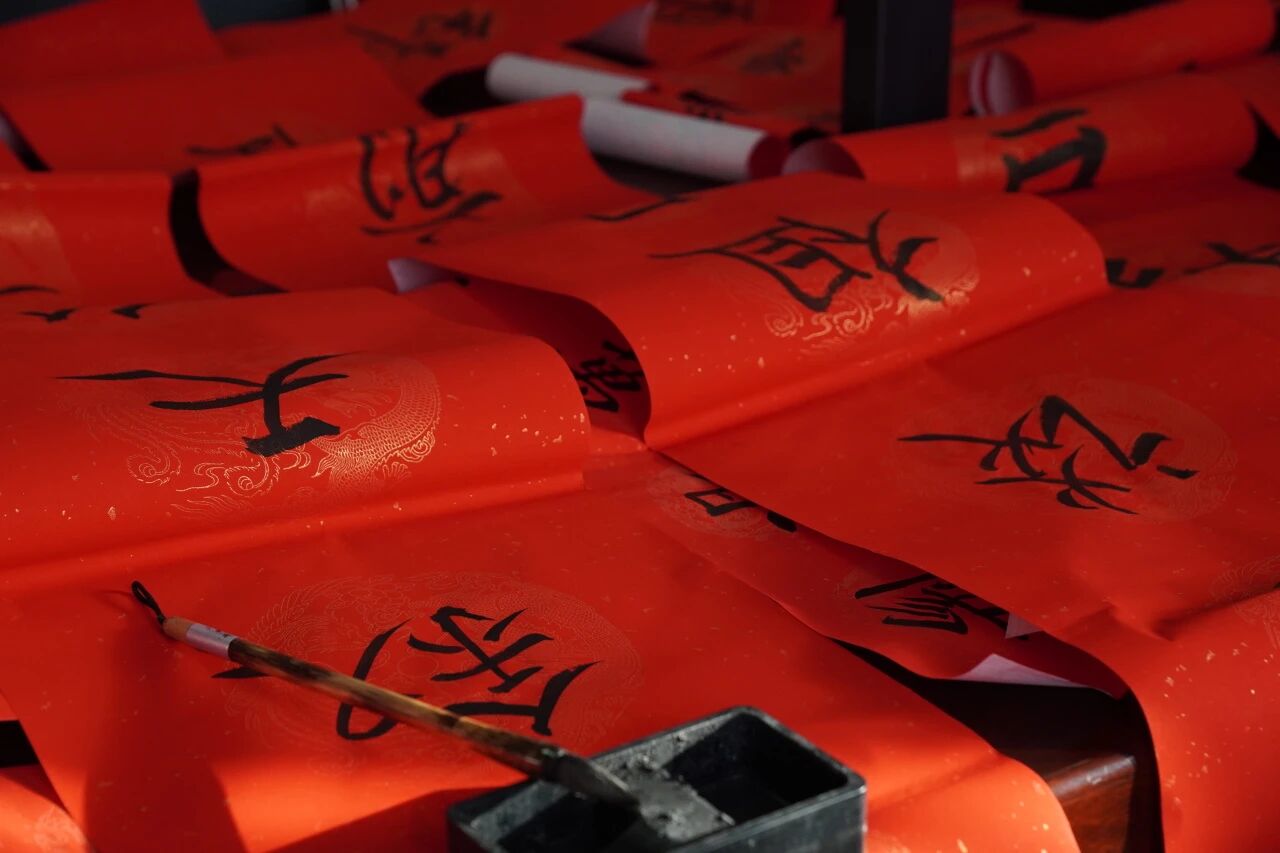 完成新民村的集中书写与分发工作后,志愿者团队转场前往庙底村居委会。抵达后,大家继续为村民挥毫送福。临近中午,志愿者团队在当地饭店用餐后,马不停蹄返回庙底村居委会,并且对已写好的春联进行分类整理、清点数量,确保每位前来领取的村民都能满意而归,现场氛围热闹又温馨。“手写的春联有温度,剪纸也好看,来居委会就能领到,太方便了!”庙底村张书记拿着春联,笑得合不拢嘴。