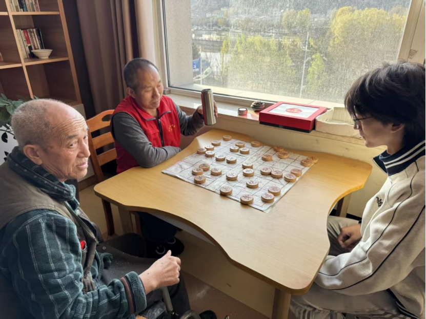 活动伊始,志愿者们便主动与老人们亲切问候,熟悉的乡音、温暖的笑容瞬间拉近了彼此距离,原本略显安静的养老院很快热闹起来。拉着志愿者的手,慢慢讲述自己年轻时的读书经历,志愿者认真倾听,偶尔点头回应,阳光透过窗户洒在两人身上,画面格外治愈。在活动室的象棋桌前,几位热爱下棋的老人早已摆好棋盘,志愿者们围坐一旁,或虚心向老人请教棋艺,或与老人对弈交锋。老人们脸上满是笑容,一边落子,一边给志愿者讲解下棋的技巧与思路,棋盘上的楚河汉界,成了两代人交流的“桥梁”,每一步棋、每一句叮嘱,都满是温情。棋盘上楚河汉界分明,棋子起落间,不仅有棋艺的交流,更有代代相传的人生经验,笑声与赞叹声此起彼伏。