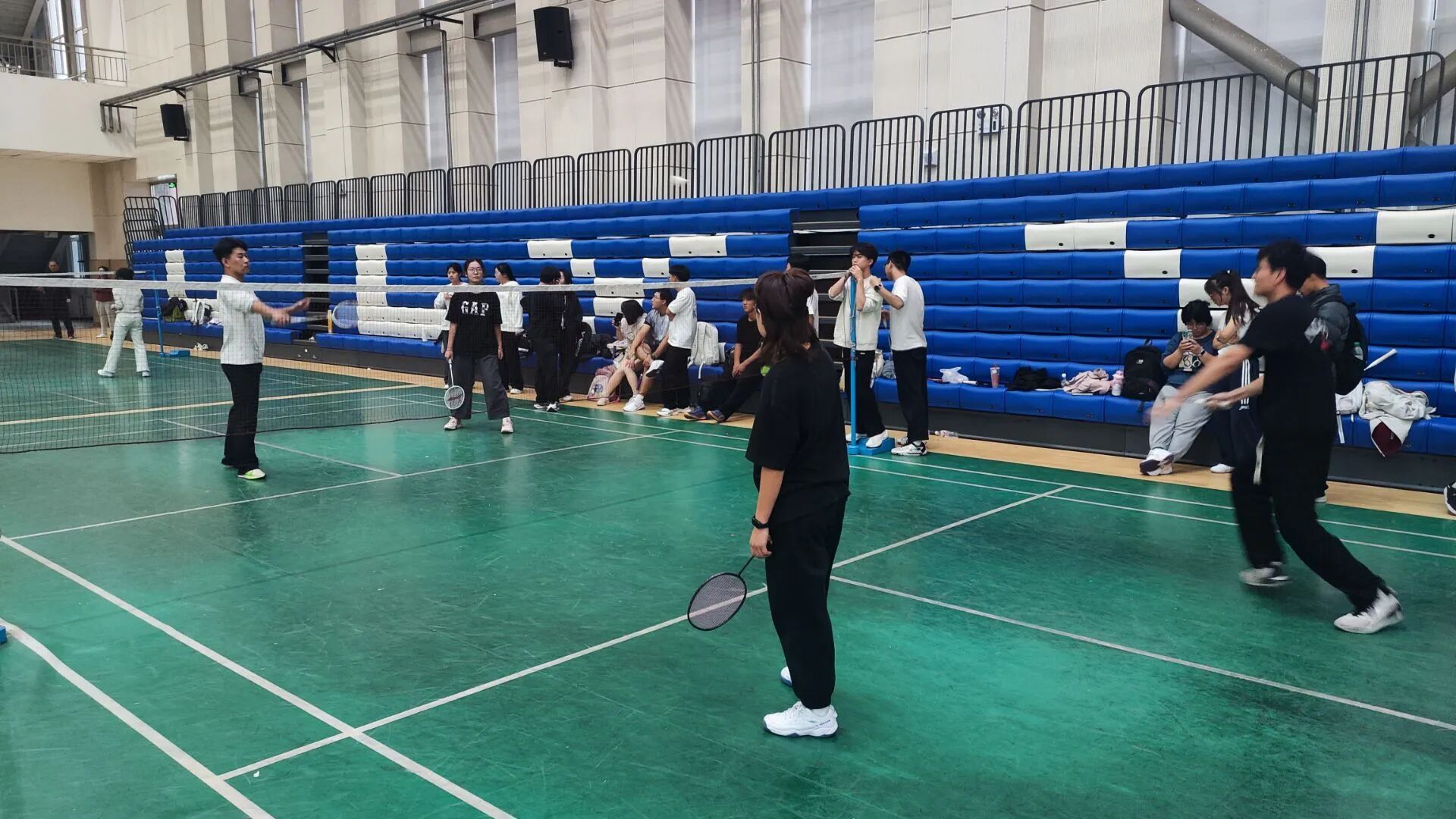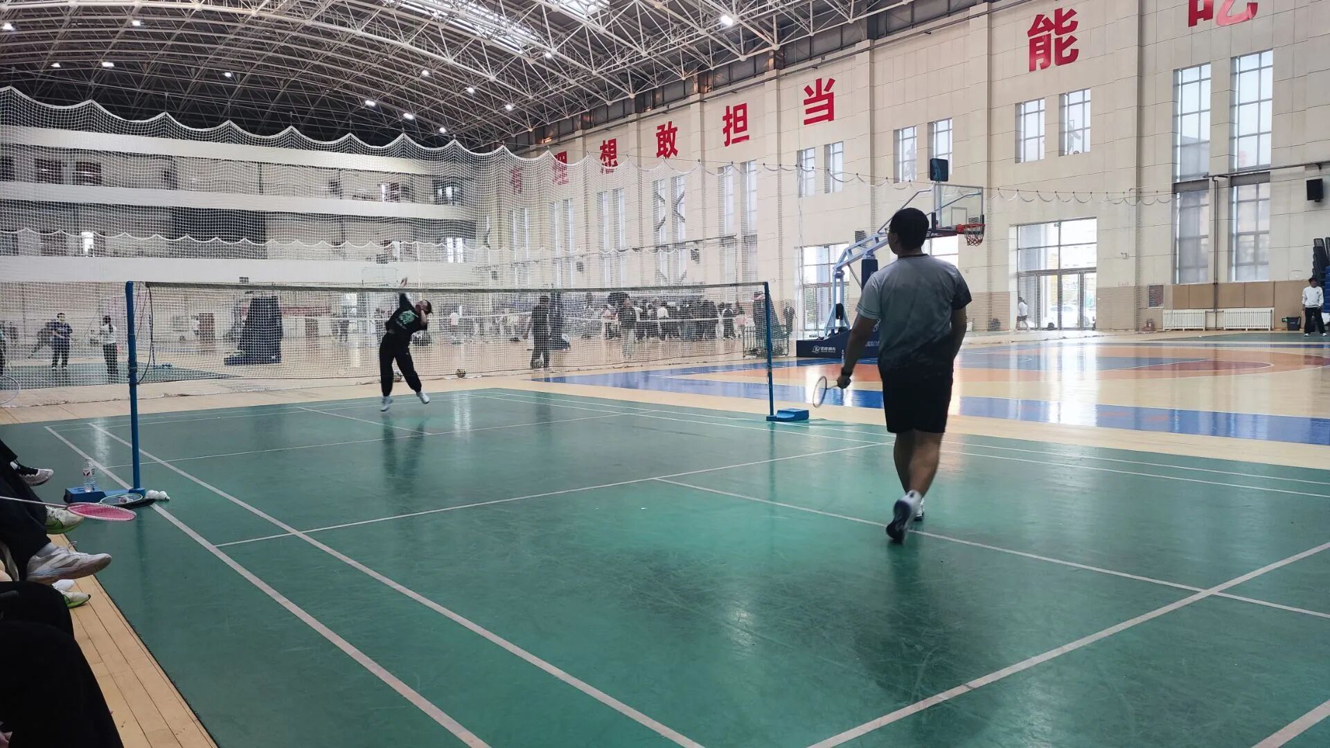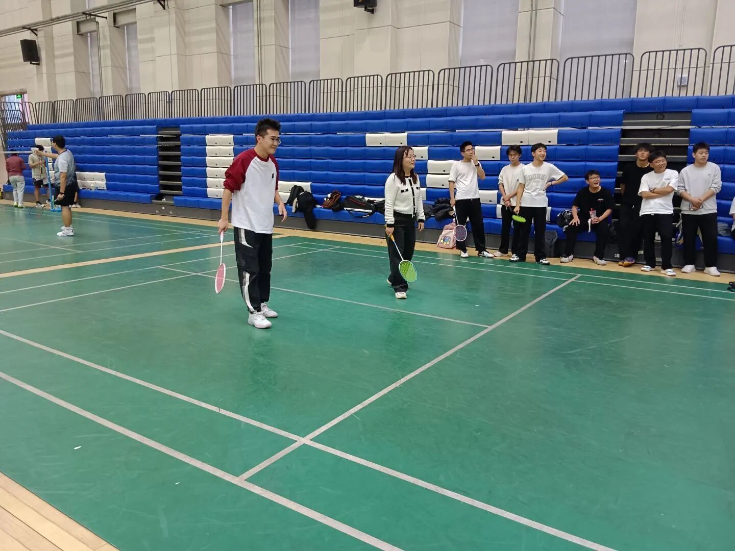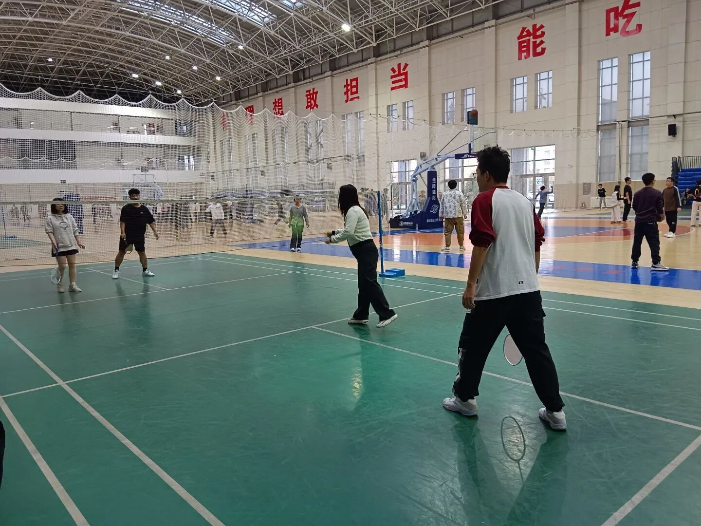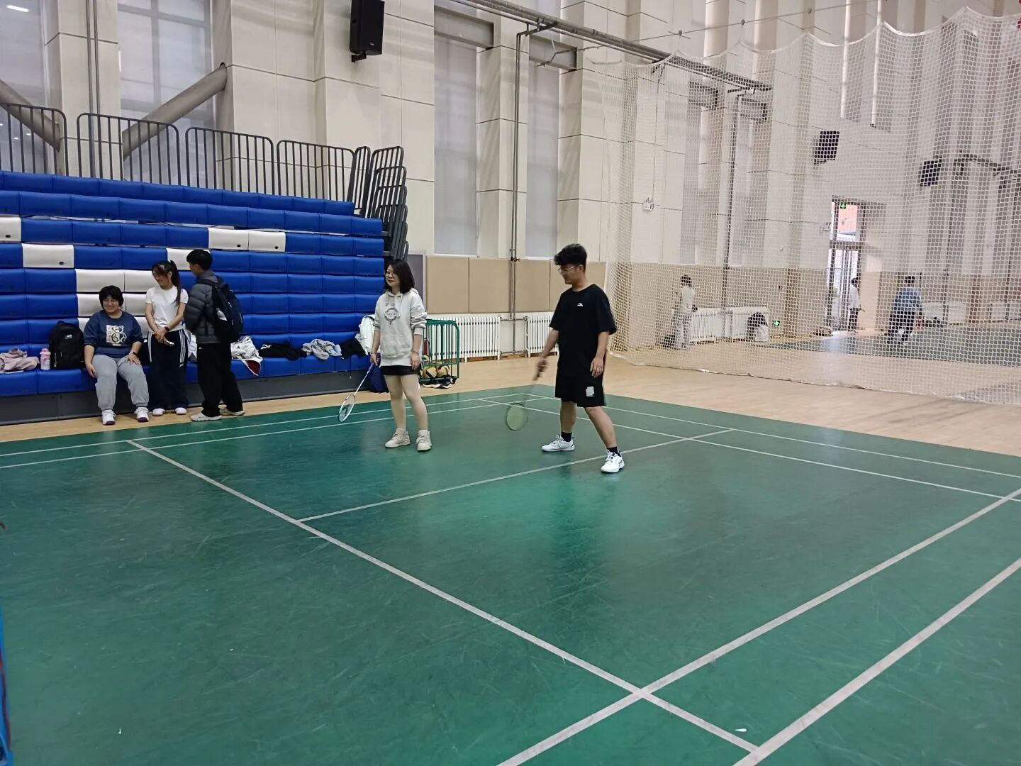 作为校园特色文体活动,本次友谊赛以“轻松互动、共享乐趣”为核心,未设置严格的排名与淘汰规则,旨在打破课堂界限,让师生在运动中拉近距离。赛前,场馆内便充满热闹氛围:师生自由组队热身,彼此交流打球技巧,从握拍姿势到步伐调整,专业建议与热情分享交织,原本的师生身份在此刻化作并肩切磋的“运动伙伴”,赛场提前洋溢起轻松融洽的气息。