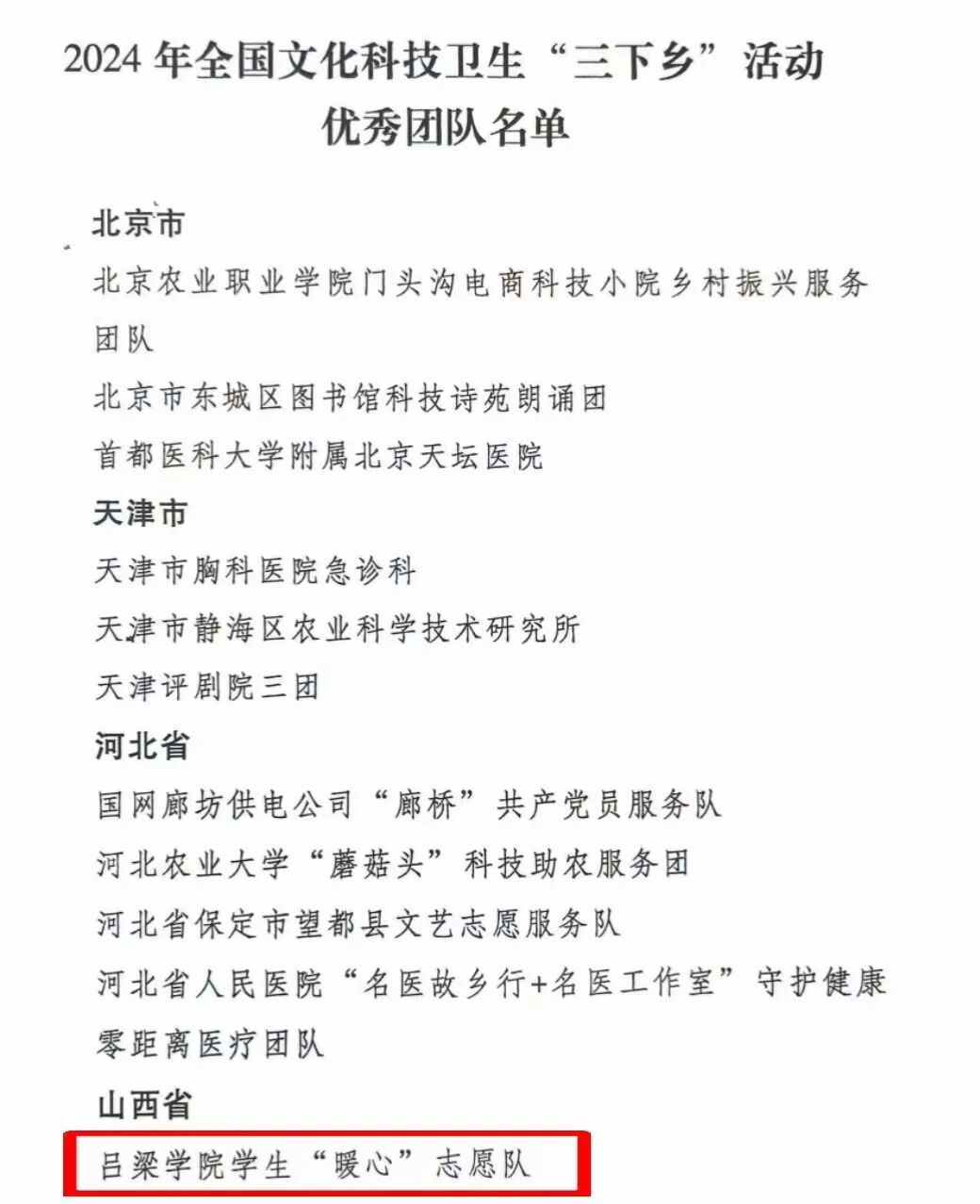 近日,中央宣传部会同国家发展和改革委员会等12个部门联合开展2023,2024年全国文化科技卫生“三下乡”活动优秀团队展示活动,推选“京科惠农”科技服务团队等199个集体为优秀团队。其中吕梁学院学生“暖心”志愿队凭借“关爱留守儿童,助力乡村振兴”的主题实践成功入选,成为山西省唯一高校沉淀着青春温度的标杆队伍。