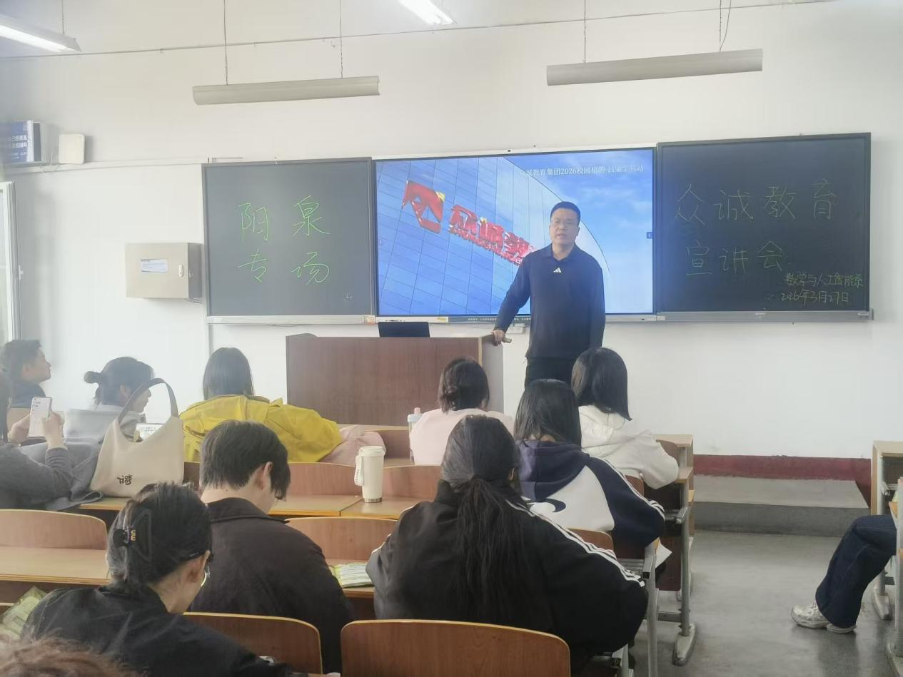 为精准引育高素质教育人才,助力高校学子明晰职业方向,搭建校企合作双向桥梁,近日,众诚教育阳泉专场校园招聘宣讲会在吕梁学院顺利举办。本次活动聚焦教育类相关专业学子,以“聚才育新,诚赴未来”为主题,通过公司介绍、人才需求解读、成长计划分享、求职指导等多元环节,现场氛围热烈而真诚。